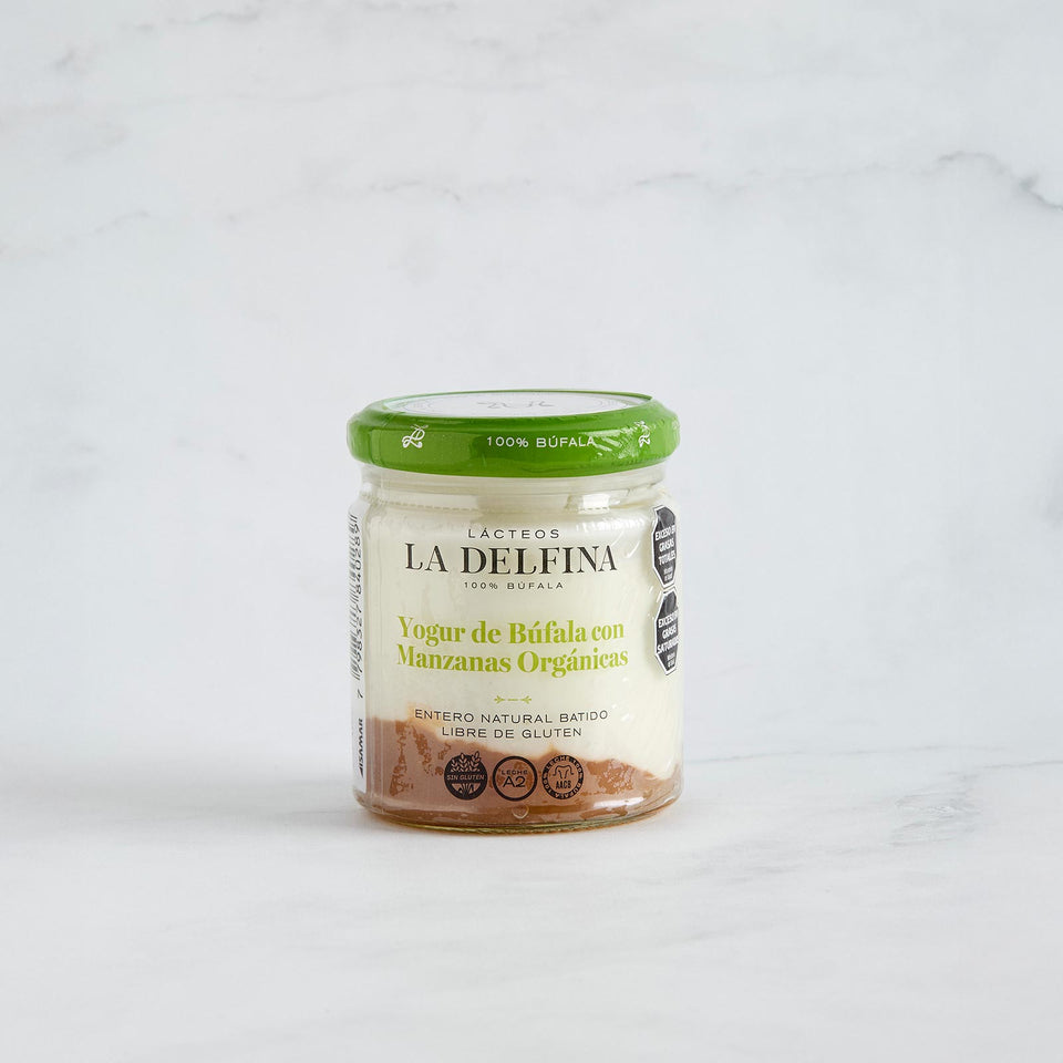 Yogur batido con colchón de manzana. Producido solamente conleche, fermentos y almidón. De sabor delicado y gran estructura.Producto de la mezcla de leche de búfala y fermentos lácticosvivos únicamente, nuestro yogur presenta un sabor auténtico, unatextura cremosa y compacta, y un especial aroma a yogur fresconatural, acompañado de un colchón de frutas.Duración: 30 días.